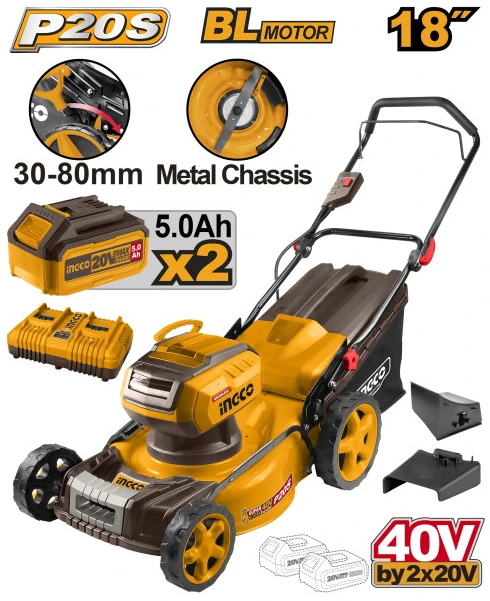 INGCO Akkus fűnyíró 460 mm 2 x 20 V szénkefe nélküli (2 x 5,0 Ah akku + töltő)